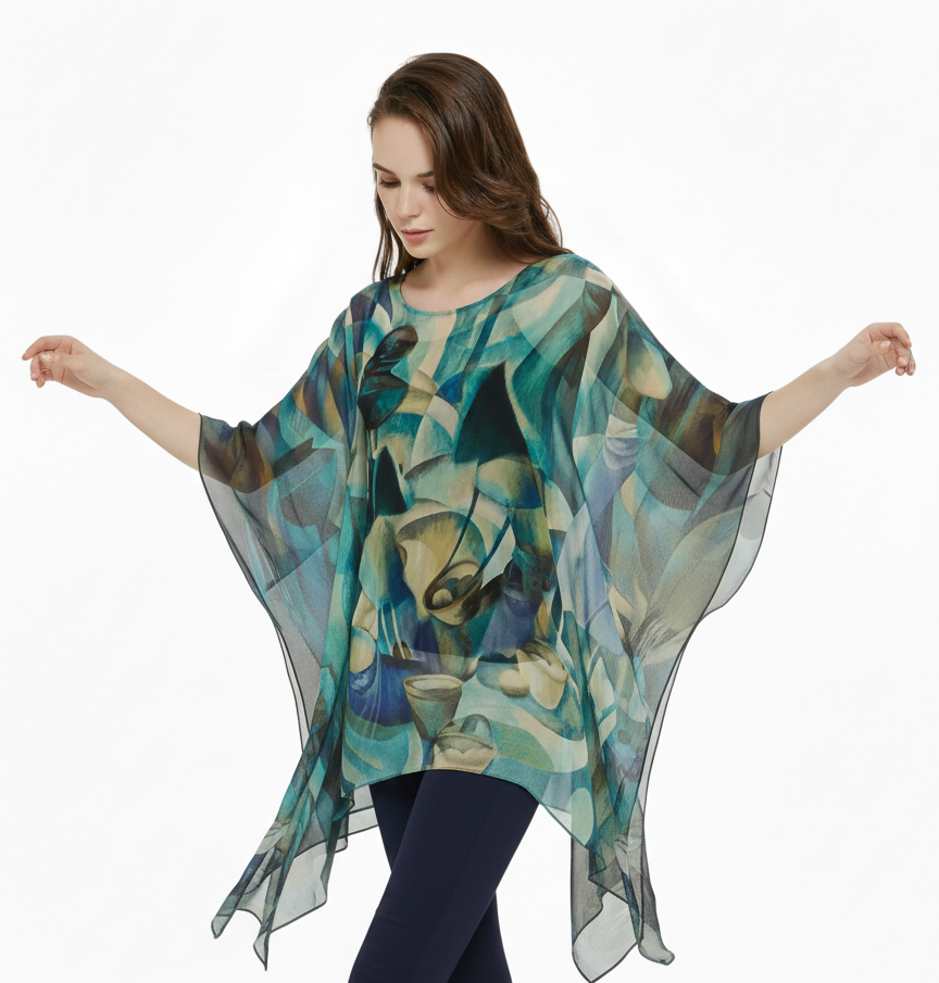 …un’attualissima mantella in georgette tinta unita o fantasia..